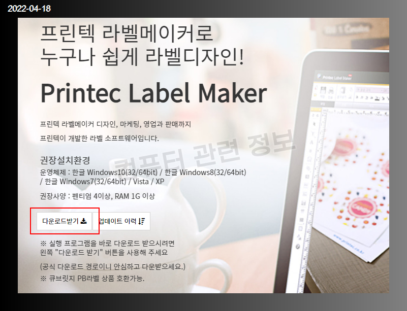위 링크로 이동해서 다운로드 받기를 클릭하세요. 위 링크가 열리지 않으면 홈페이지로 이동해서 소프트웨어 메뉴 아래 프린텍 라벨 메이커 메뉴가 있습니다. 클릭.