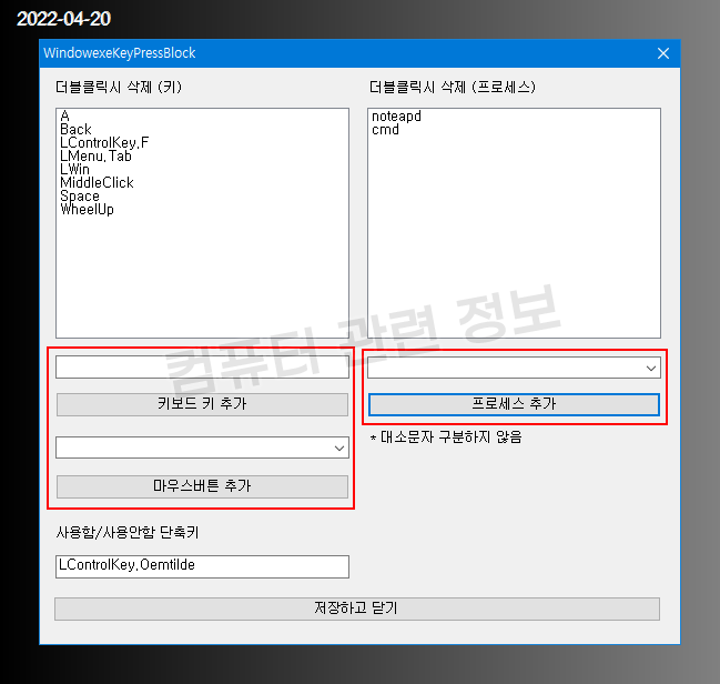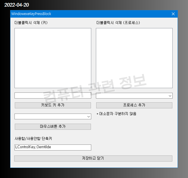 왼쪽에는 차단 시킬 키와 마우스 버튼 항목이 있습니다.
