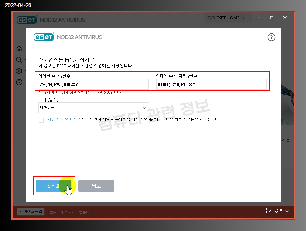 이메일 주소는 아무거나 써도 활성화가 됩니다.
