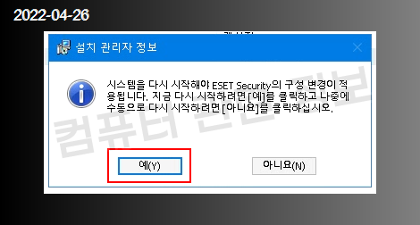 시스템을 재부팅할건지 물어보는데 예를 클릭하세요.