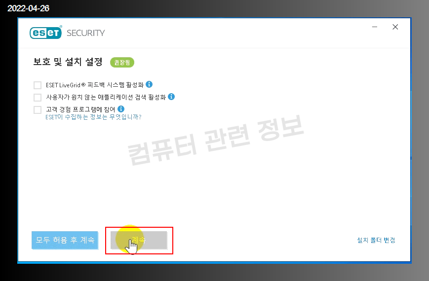 피드백 및 고객 참여 관련 항목이 있습니다. 필요없으므로 계속 클릭.