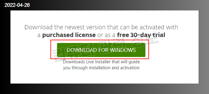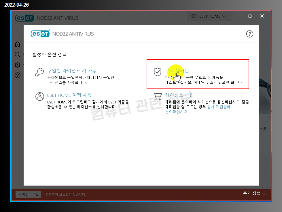프로그램 설치가 완료되었습니다. 무료 평가판 등록을 클릭.