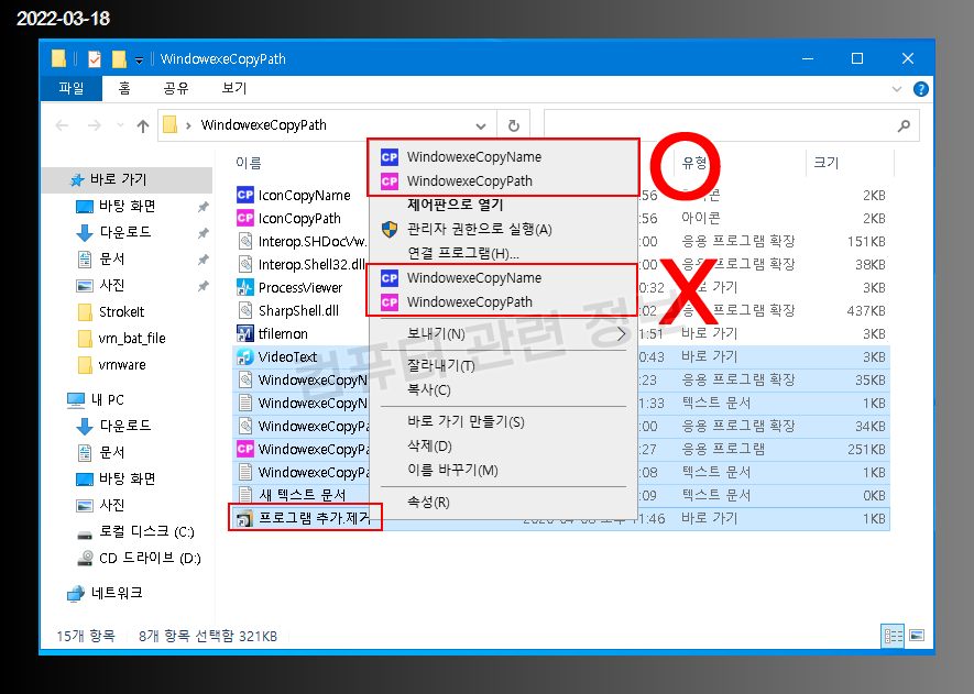 프로그램을 삭제하려면 WindowexeCopyPath 파일을 관리자권한으로 실행하고 탐색기 쉘 메뉴 삭제를 클릭하세요.