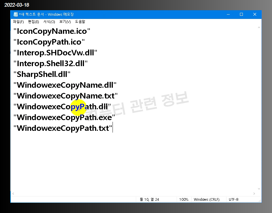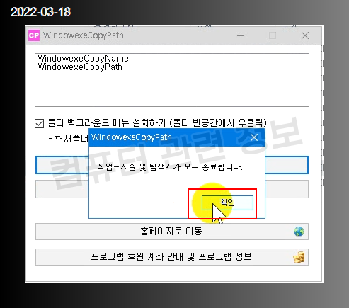 WindowexeCopyPath 메뉴를 클릭한 화면입니다. 폴더 경로 및 파일이름이 모두 복사됩니다.