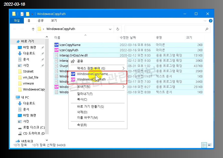 WindowexeCopyName 을 선택한 경우 이름만 복사