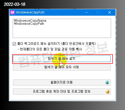 탐색기 쉘 메뉴 설치를 클릭하세요.