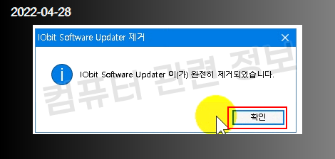 제거가 완료되었다는 메세지가 나옵니다. 확인을 클릭하면 됩니다.