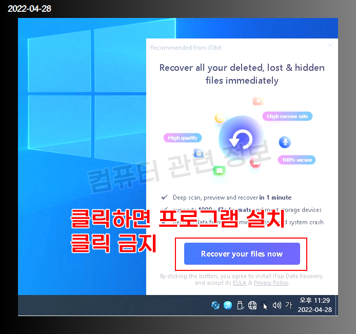 프로그램 실행후 오른쪽 하단에 광고가 뜨는데요. 클릭하면 프로그램이 설치됩니다.