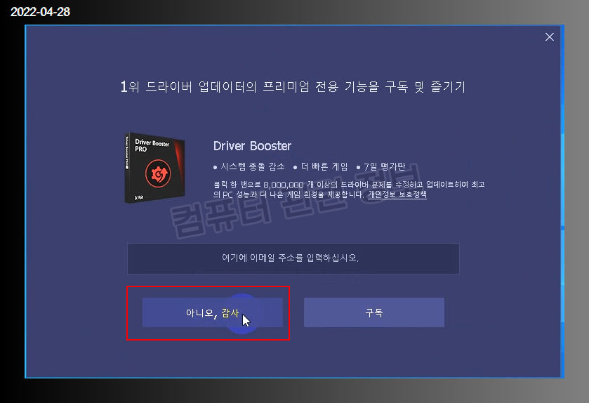 프로그램 설치가 완료되었네요. 구독은 필요없으므로 아니요 감사 클릭.