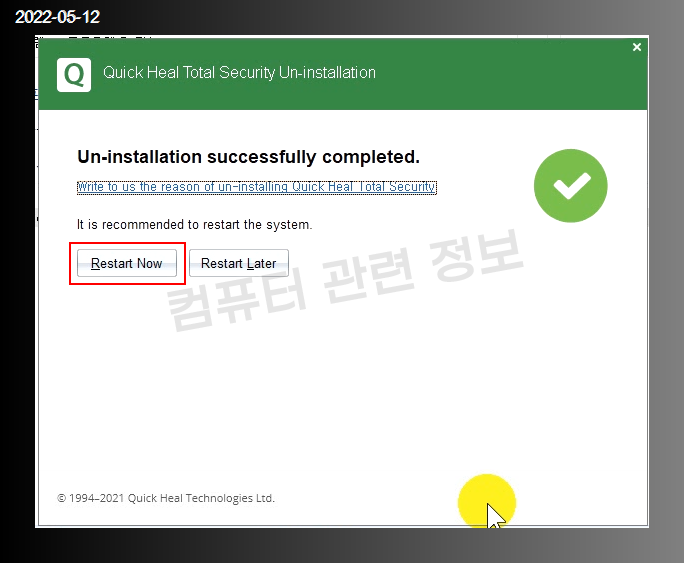 프로그램 제거가 완료되었습니다. Restart Now 클릭하면 시스템을 재부팅합니다.