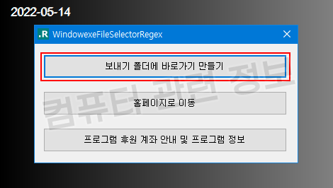 윈도우 탐색기를 열어서 아무폴더나 파일을 선택하고 마우스 우클릭하고 보내기 - WindowexeFileSelectorRegex 를 클릭하세요.