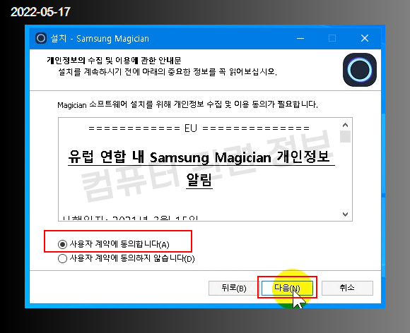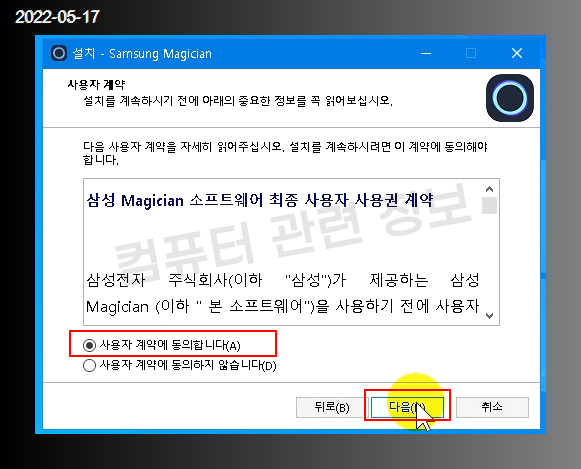 사용자 계약 동의에 관한 내용이 나옵니다. 동의에 체크하고 다음 클릭.