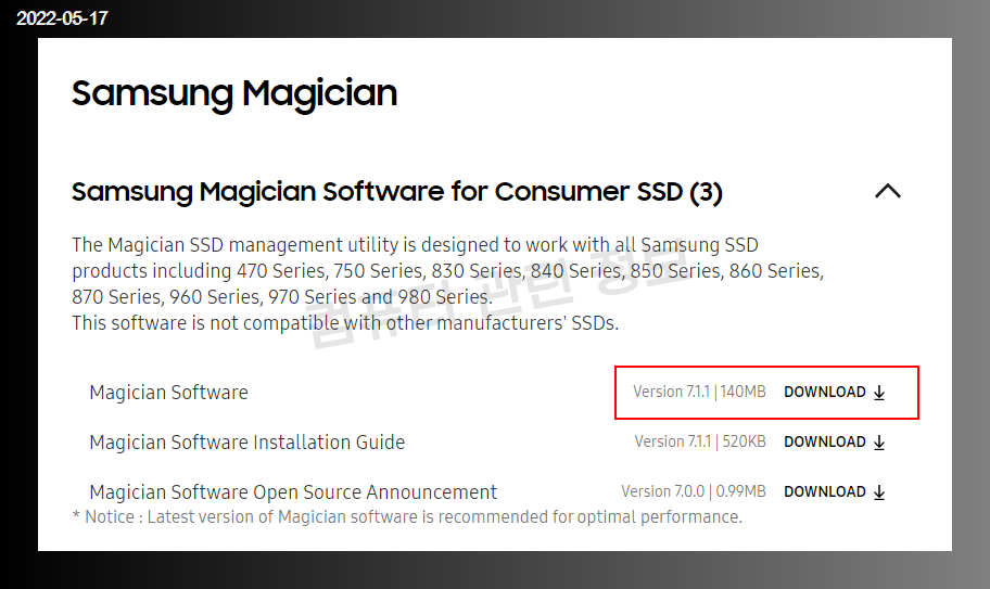 현재 올라와 있는 버전은 7.1.1 입니다. Magician Software 옆의 Download 링크를 클릭하세요.