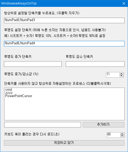 항상위로 설정하는 단축키와 투명도를 설정하는 단축키를 설정할 수 있습니다.