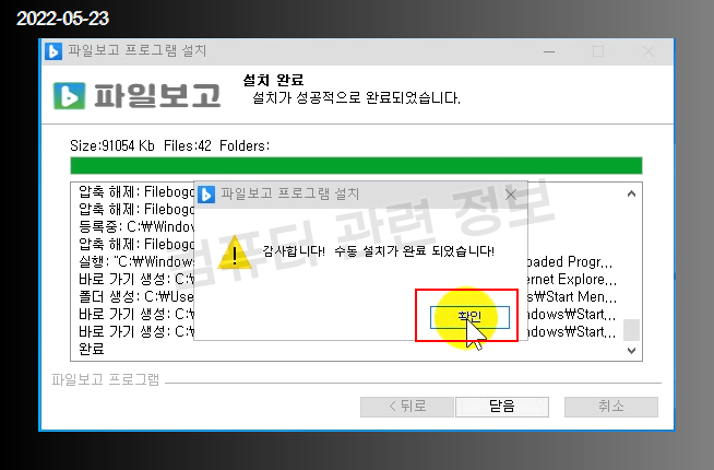 프로그램 설치가 완료되었습니다. 확인을 클릭.