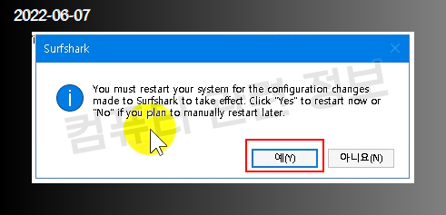 아니요를 클릭하고 나중에 재부팅해도 됩니다.