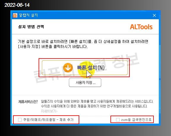 알집, 알씨, 쿠팡 바로가기, 줌 홈페이지 설정, 알약등을 설치하는데 악성코드나 다름없습니다.
