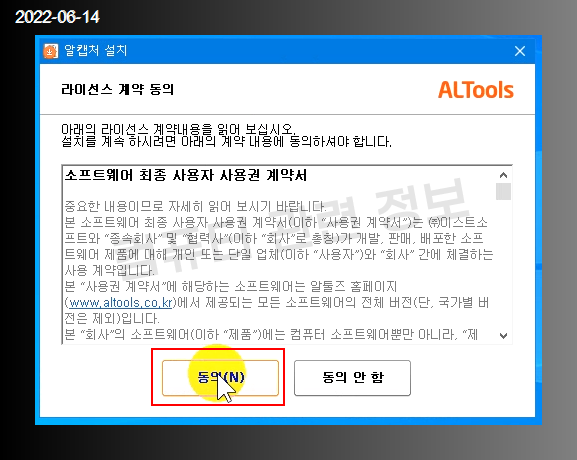 프로그램 라이센스 화면이 나오는데 동의 클릭.
