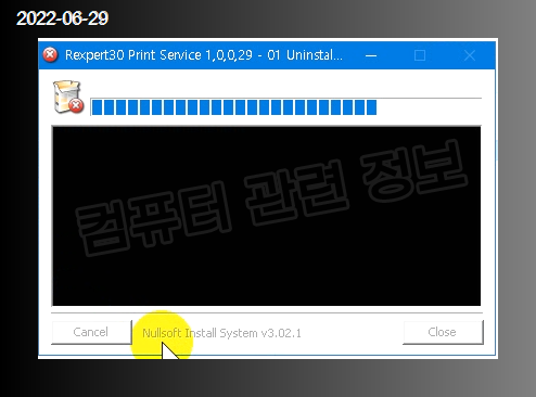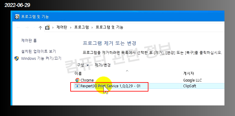 제어판 - 프로그램 추가/제거로 이동해서 Rexpert30 Print Service 1,0,0,29 를 더블클릭하세요. (버전 번호는 다를 수 있음)