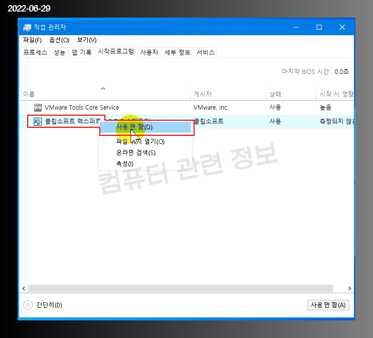 자동실행을 중지시키려면 작업관리자 - 시작 프로그램 탭에서 클립소프트 렉스퍼트 3.0 EXE 스타트업(32비트)를 마우스 우클릭해서 사용안함으로 변경하면 더이상 자동으로 실행이 되지 않습니다.