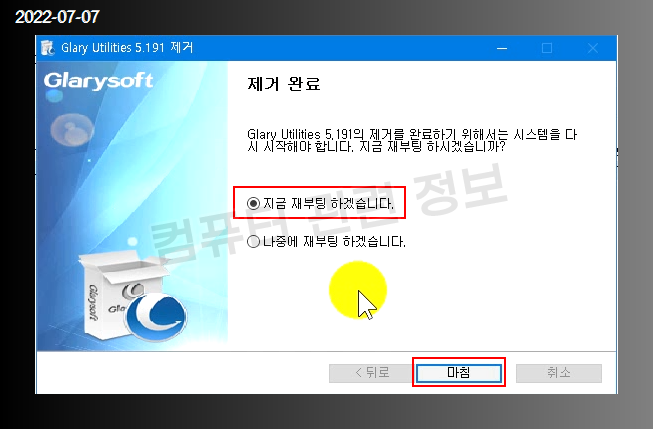 프로그램이 모두 삭제되었습니다. 재부팅을 필요로 하는데 마침을 클릭하세요.