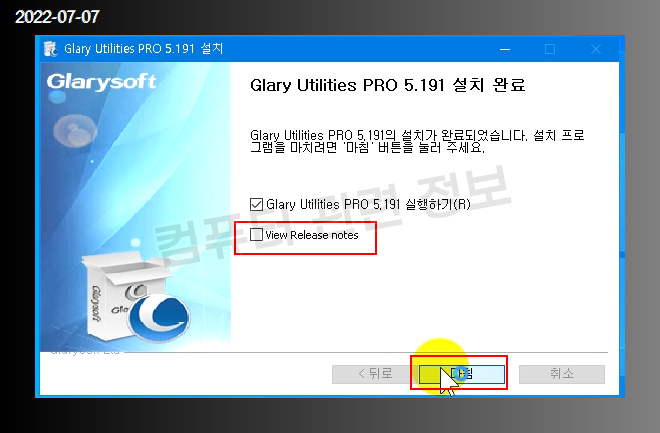 프로그램 설치가 완료되었습니다. 마침을 클릭하세요. 릴리즈 정보는 필요없으므로 체크해제.
