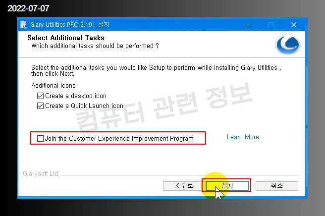 프로그램 개선에 참여할건지 물어보는데 불필요하므로 체크해제하고 설치 클릭.