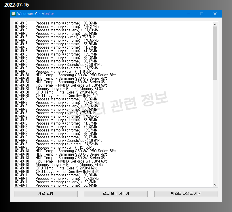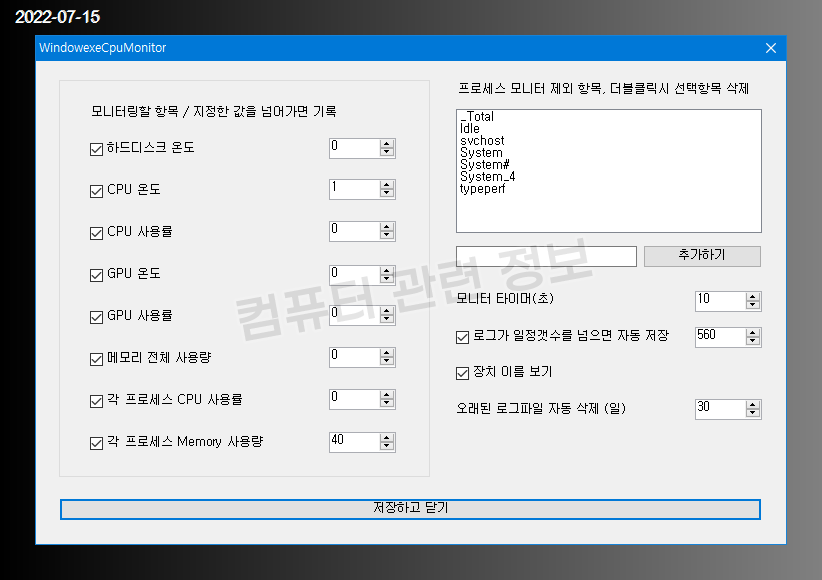 CPU/GPU 사용률 및 온도, 메모리 사용량, 각 프로세스별 CPU 및 메모리 사용량, 하드디스크 온도중 일정한 값을 초과하는 것만 모니터링해서 로그로 자동 저장하는 프로그램입니다.