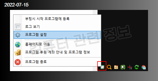 설정을 변경하려면 작업표시줄 오른쪽 시스템 트레이에 CPU 모양 우클릭해서 설정 클릭.