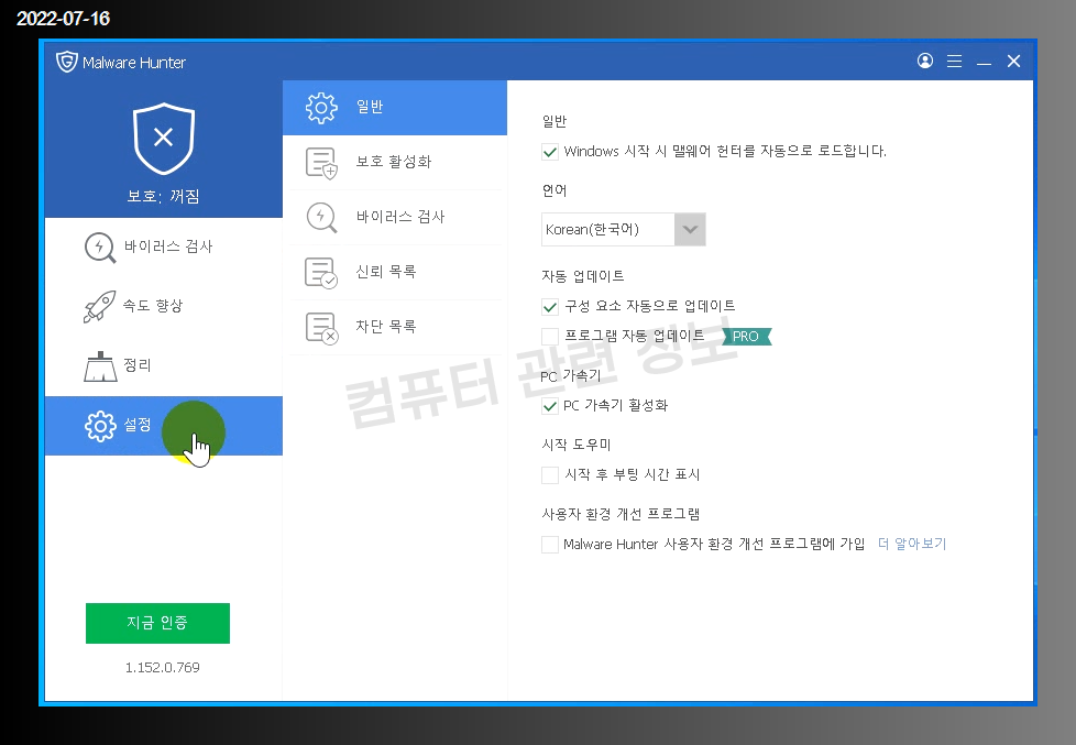 이 프로그램은 무료로 사용가능한 버전인데 제품키를 등록하면 Malware Hunter Pro 버전으로 전환이 됩니다.