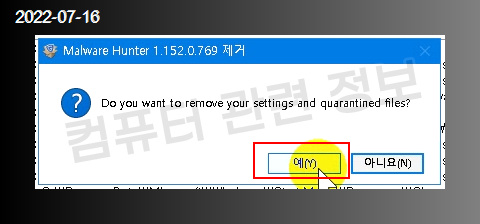 Malware Hunter 관련 설정 및 백업파일을 제거할건지 물어보는데 예 클릭. 필요하면 아니요 클릭.