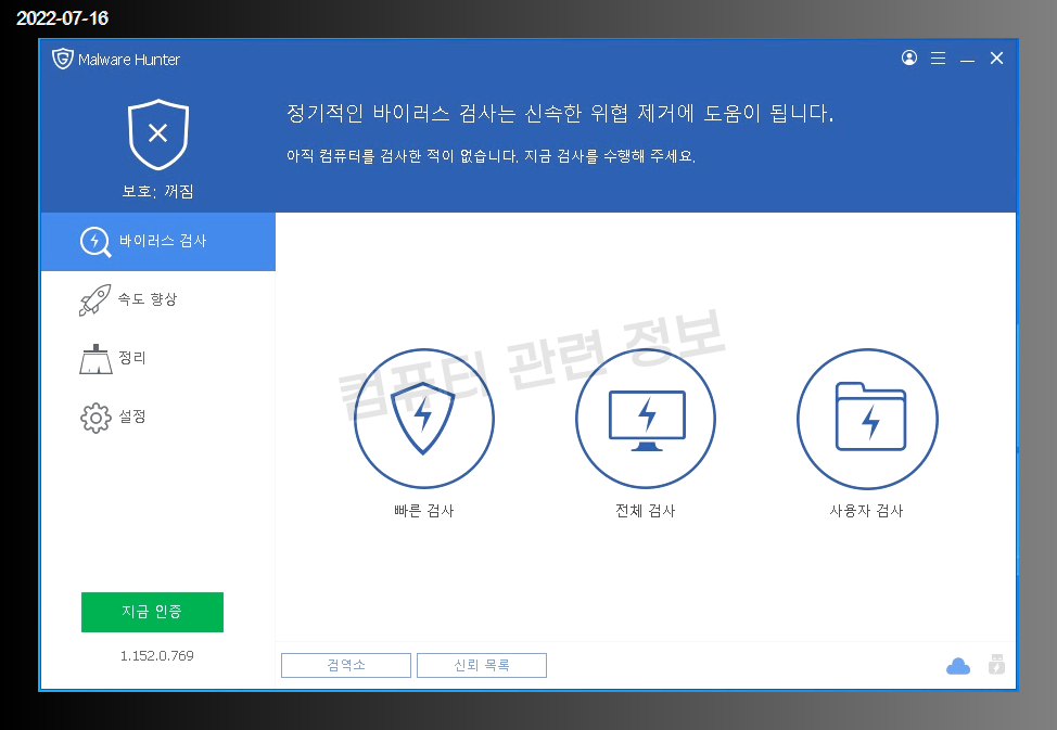 프로그램 주요기능 : 멀웨어 제거, 시스템 스피드업, 디스크 정리, 프로세스 보호등