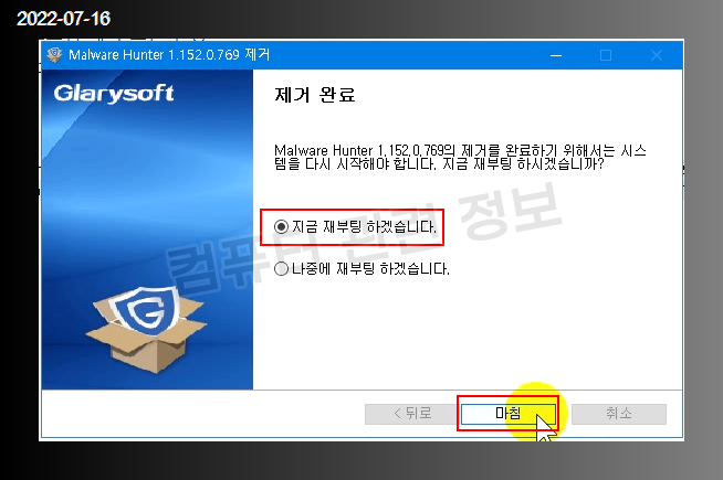프로그램이 제거되었습니다. 재부팅할건지 물어봅니다.
