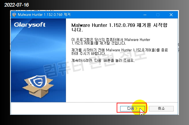 프로그램을 삭제할건지 물어보는데 다음 클릭.