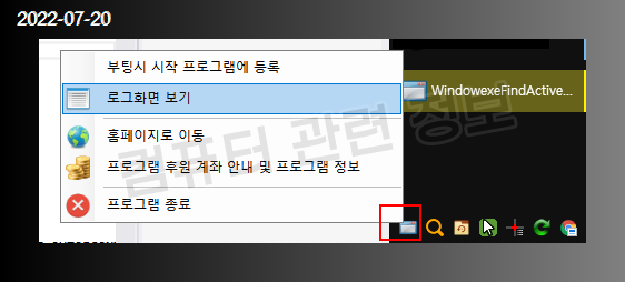 로그를 보려면 작업표시줄 오른쪽 시스템 트레이에 윈도우 모양의 아이콘에서 마우스 우클릭하세요.