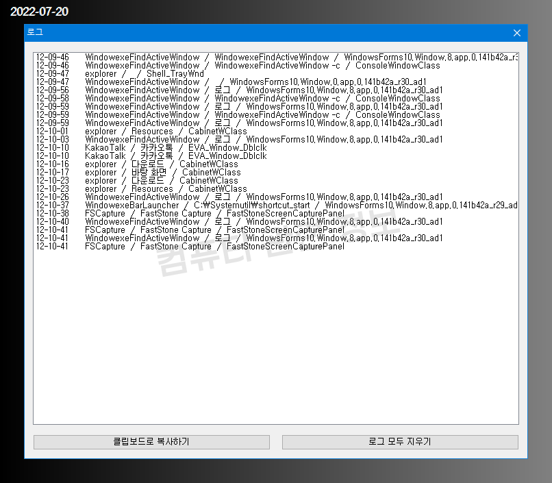 이벤트 발생 시간, 프로세스 이름, 윈도우 타이틀, 클래스 이름이 표시됩니다.