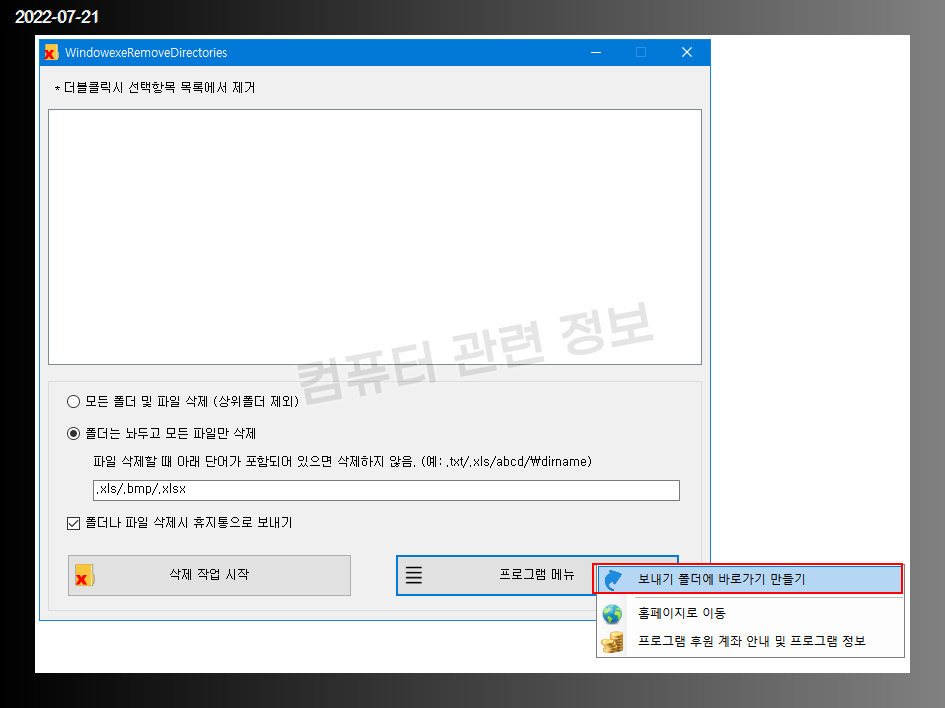 윈도우 탐색기에서 폴더를 삭제할 때는 선택한 폴더, 모든 하위 폴더 및 파일이 삭제가 되는데요. 삭제하고자 하는 대상 폴더는 놔두고 그 밑에 있는 폴더나 파일을 모두 삭제할 수 있는 프로그램입니다.