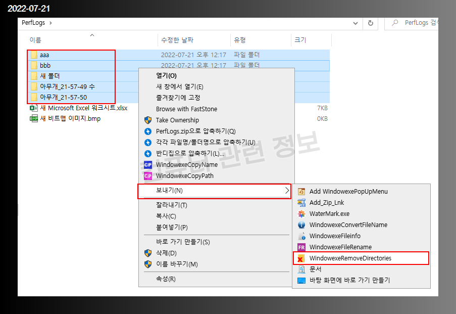 윈도우 탐색기에서 삭제하고자 하는 폴더를 선택하고 마우스 우클릭 - 보내기 - WindowexeRemoveDirectories 를 클릭하세요.