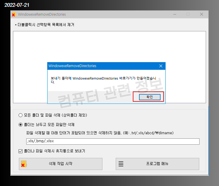 파일명은 변경하지 마세요. WindowexeRemoveDirectories 가 아니면 실행이 되지 않습니다.