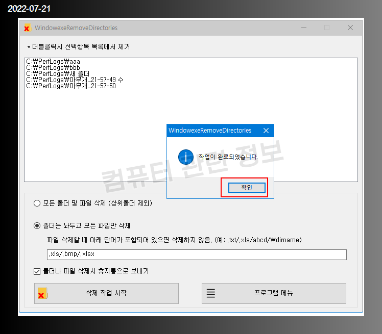 하단에 있는 삭제 작업 시작 버튼을 누르고 잠시 기다리면 작업완료 메세지가 나옵니다.