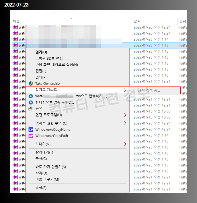 윈도우 탐색기 우클릭 메뉴입니다. 장치로 캐스트 - 장치 검색중... 이라고 나오네요.