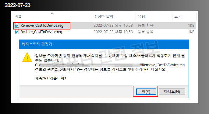 메뉴를 원래대로 복구하려면 Restore_CastToDevice.reg 파일을 실행하고 재부팅하면 됩니다.