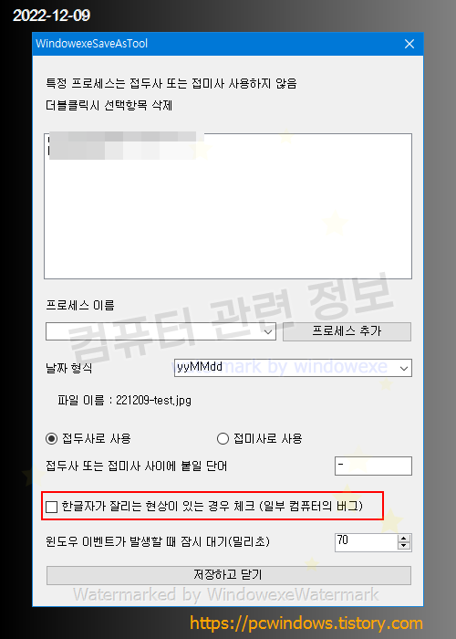 파일 저장 대화상자가 나올때 오늘 날짜 및 현재 시간등 사용자가 지정한 접두사를 자동으로 붙이는 프로그램입니다.