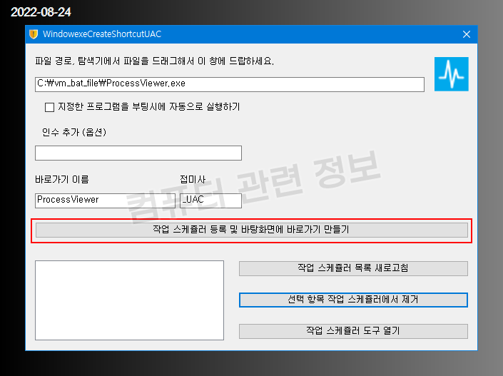 이런 방법으로 사용자 계정 컨트롤 메세지를 숨길 수가 있기는 한데요. 작업 스케쥴러에 프로그램을 등록하고 바로가기를 만드는 작업은 상당히 귀찮기 때문에 간단히 추가할 수 있도록 프로그램으로 만들게 되었습니다.