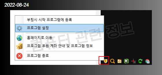 우클릭하면 나오는 프로그램 메뉴 (설정 메뉴는 삭제함, 좌클릭으로 실행)