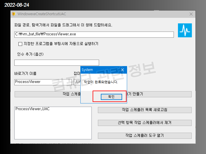 작업 스케쥴러 등록 및 바탕화면 바로가기 만들기를 클릭하세요.
