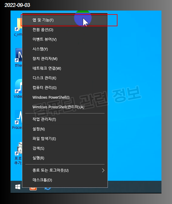시작 메뉴에서 마우스 우클릭하고 앱 및 기능을 클릭하세요.