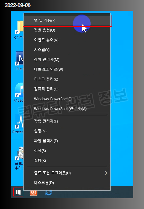 시작 메뉴 - 우클릭 - 앱 및 기능을 클릭하세요.