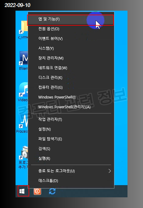 시작 메뉴 - 우클릭 - 앱 및 기능을 클릭하세요.