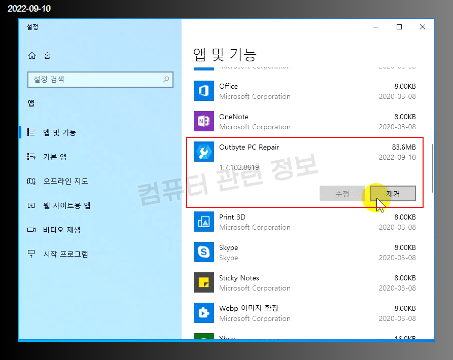 Outbyte PC Repair 를 찾아서 제거 클릭.